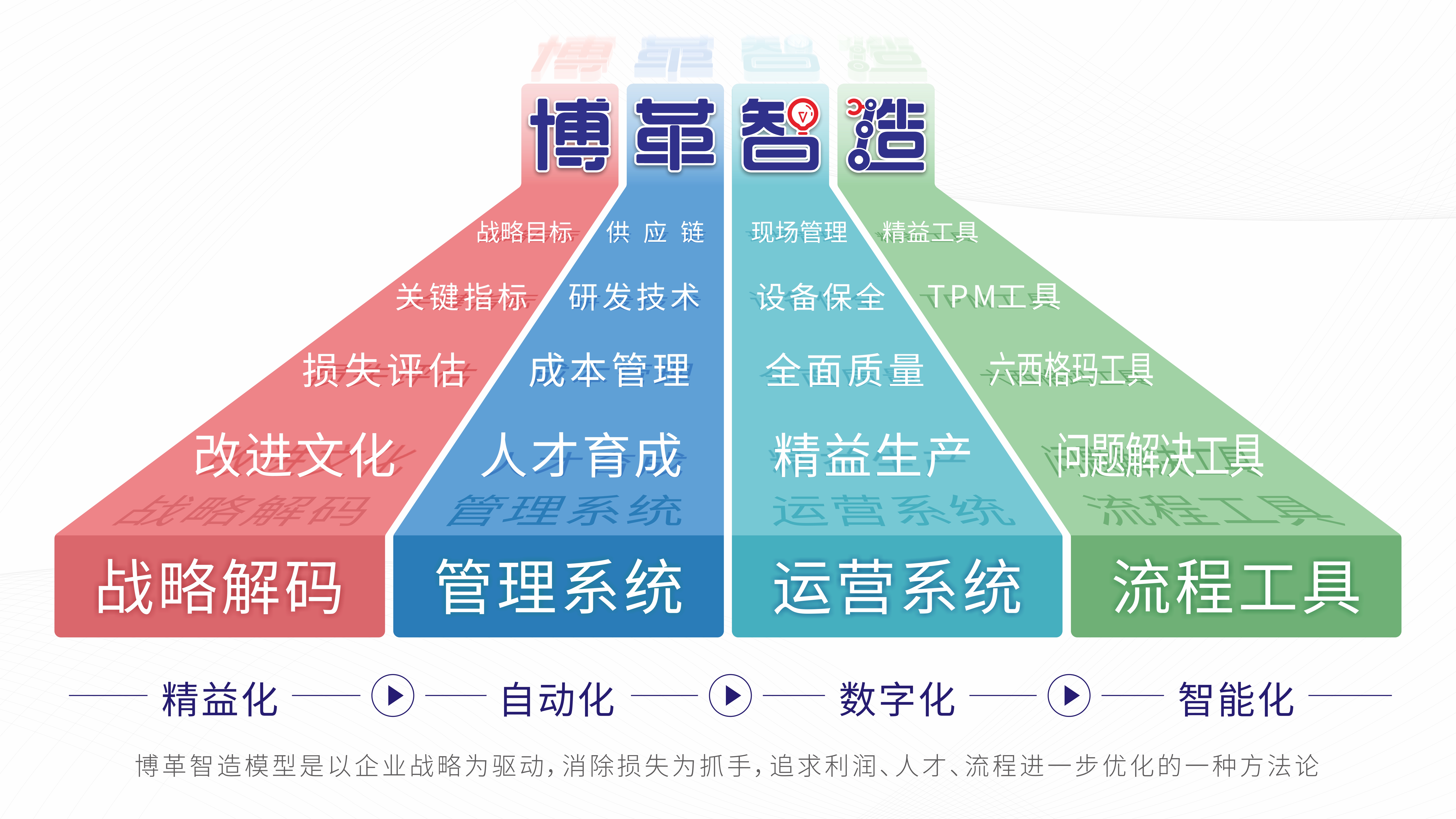 博革結合跨行業(yè)、多領域豐富的咨詢經(jīng)驗,并融合國內企業(yè)的特點,設計了博革智造的模型,幫助國內1000+企業(yè)實現(xiàn)從精益化到自動化、數(shù)字化、智能化的跨越轉變,有效為企業(yè)提升核心競爭力,實現(xiàn)智能化生產運營系統(tǒng)的搭建及陪跑,助力企業(yè)全面實現(xiàn)卓越運營。 博革顧問團隊均來自世界500強企業(yè),如豐田、三星、富士康等,其中多位專家是中國企業(yè)聯(lián)合會管理咨詢專家、全國六西格瑪推進委員會專家委員;六西格瑪注冊黑帶考試命題專家委員、韓國能率協(xié)會、日本能率協(xié)會專家。并且博革在全國擁有上百家戰(zhàn)略合作伙伴,其中包含了:自動化、數(shù)字化、智能化等各個領域的戰(zhàn)略合作伙伴。