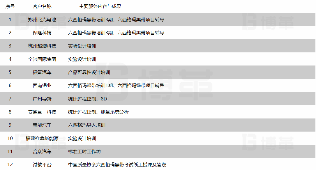 主講課程:六西格瑪BB/GB課程、實驗設計、統(tǒng)計過程控制、數(shù)據(jù)分析、問題分析解決;