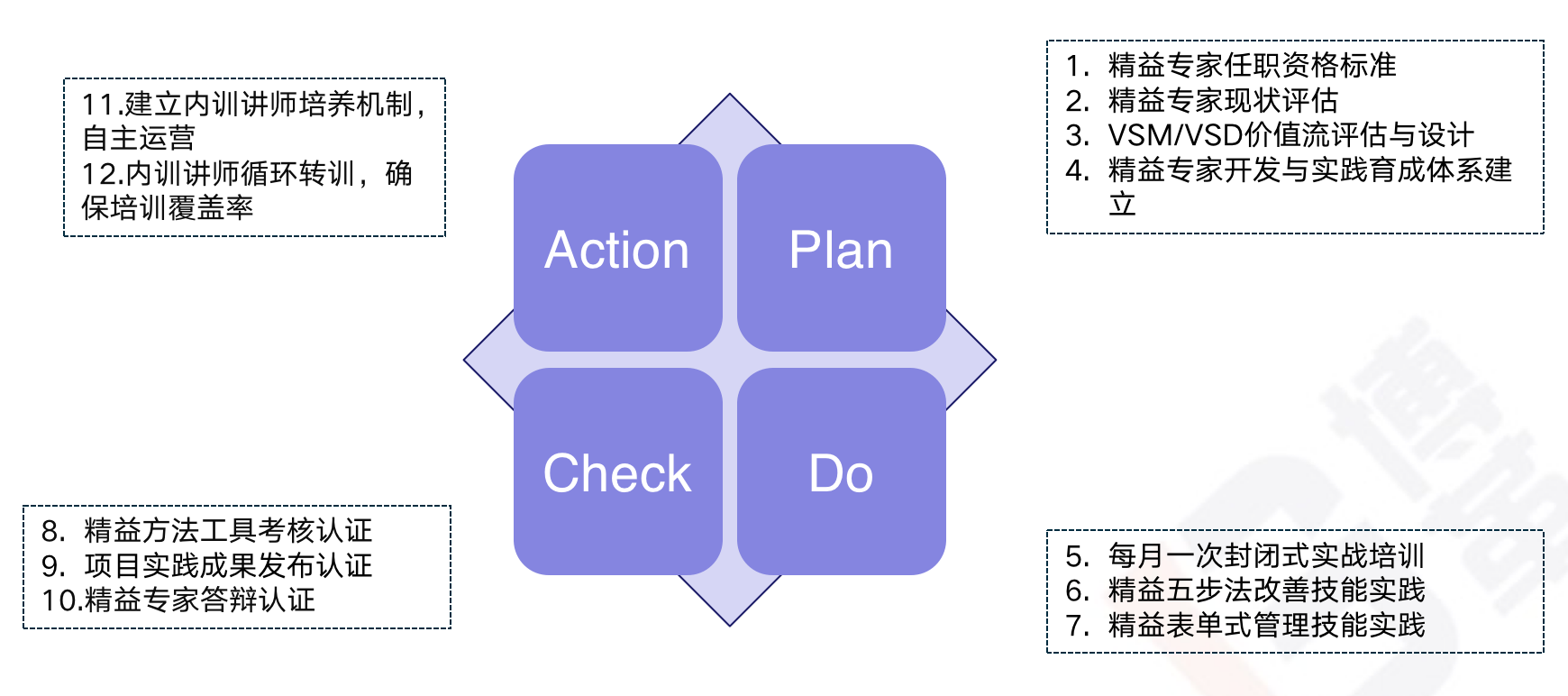將精益的理念、行為、機制、方法、工具等融入到精益五步法中,能系統(tǒng)地提升科長、經(jīng)理級人員的精益專家,使其在工作崗位中能從面的角度逐層分析,發(fā)現(xiàn)改善機會;確定實施策略并調(diào)整相關(guān)資源,從而制定計劃并實施,提升整體效率最終標(biāo)準(zhǔn)化人員的思維和行為。