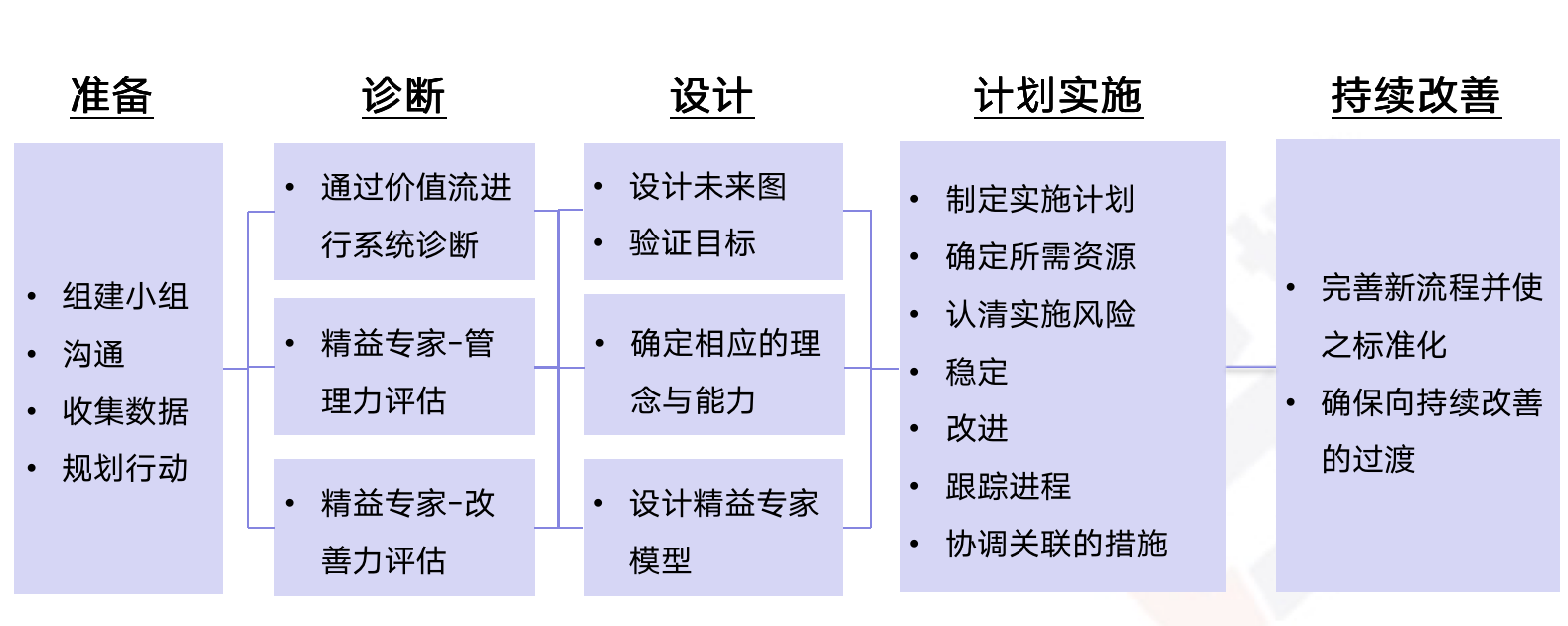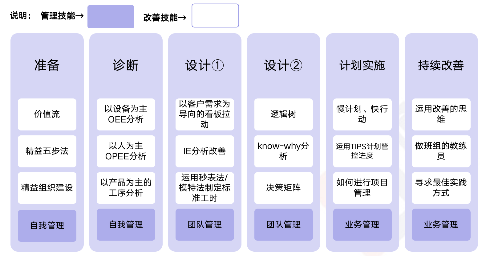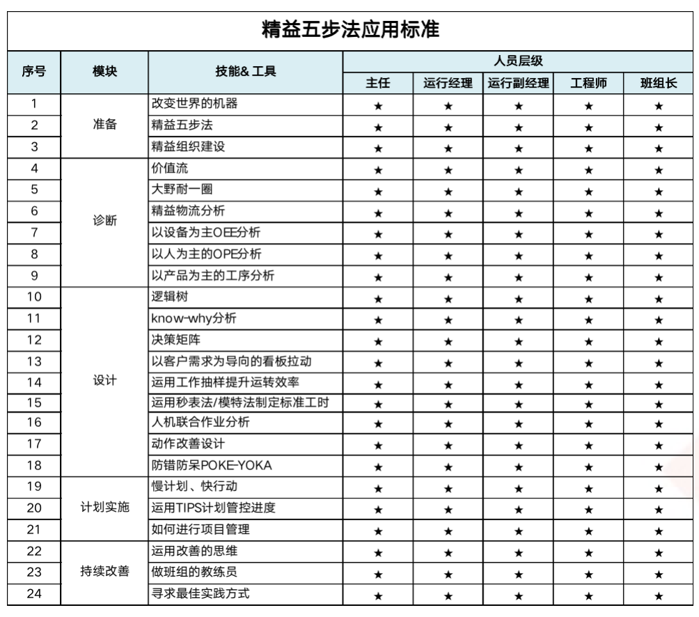 從精益五步法“準(zhǔn)備、診斷、設(shè)計、計劃實施、持續(xù)改善” 和自我管理、團隊管理、業(yè)務(wù)管理等方面,梳理各層級人員應(yīng)該掌握的技能;