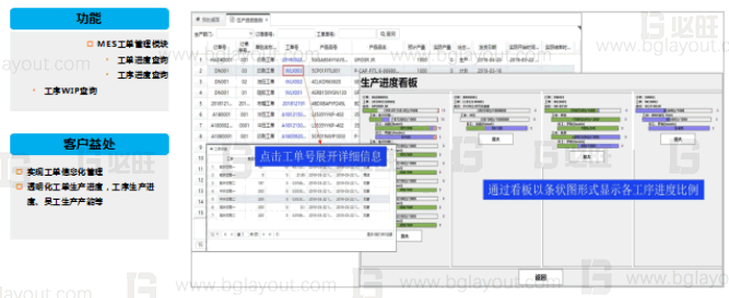 生產(chǎn)進度數(shù)字化:實時展現(xiàn)訂單、工單在各個工序的生產(chǎn)進度(計劃數(shù)量、產(chǎn)出數(shù)、不良數(shù)、在制數(shù))、工位及員工的實時生產(chǎn)進度。