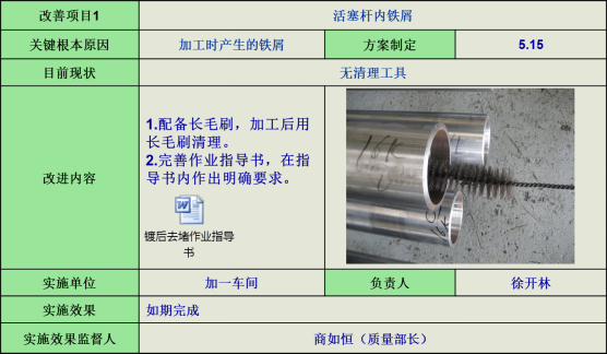 9)活塞桿內(nèi)鐵屑,針對加工時(shí)產(chǎn)生的鐵屑問題,著重清理活塞桿內(nèi)鐵屑。
