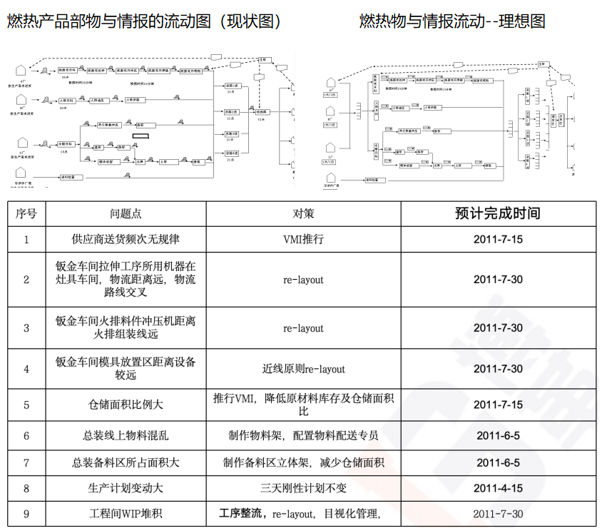 通過對配件車間內油壓機,火排沖壓設備,火排裝配線,水箱沖壓設備,小U開料設備,總裝車間備料區等設施進行重新規劃、調整,減少車間一次物流距離1500M,在制品面積下降63%,庫存金額下降50%。通過燃熱產品部物與情報現狀圖與理想圖對比,得出目前存在的問題并設置改善對策。