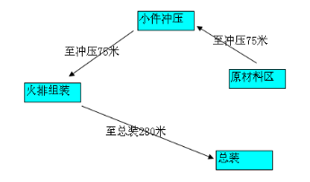 2.火排小件沖壓工序至裝配工序物流距離75M,