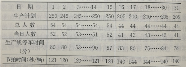 因?yàn)槠嚨男枨蠹竟?jié)性變化大,所以月與月之間生產(chǎn)量的波動(dòng)是不可避免的。但是,在一個(gè)月當(dāng)中,能夠消除天與天之間生產(chǎn)量的波動(dòng)。例如,批量生產(chǎn)的車種花冠的整體生產(chǎn)計(jì)劃,首先要按照那個(gè)月的預(yù)測(cè)需求量制定以月為單位的生產(chǎn)數(shù)量計(jì)劃。通過(guò)簡(jiǎn)單地用這個(gè)月的勞動(dòng)天數(shù)去除月生產(chǎn)數(shù)量,求出每天的生產(chǎn)輛數(shù),就可以計(jì)劃出每天定量生產(chǎn)的平均輛數(shù),這就是總量均衡在這個(gè)總量均衡的概念中,不考慮花冠有多樣的規(guī)格種類,只考慮從整體上看花冠這一大宗車種每天保持的平均生產(chǎn)量。