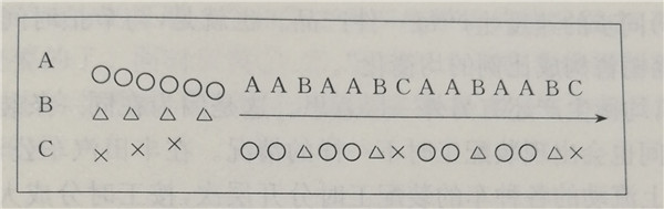 于是,如果用節(jié)拍時間制造所有的品種,每種產(chǎn)品都要用全部車種的平均節(jié)拍時間來制造,而每種產(chǎn)品的節(jié)拍時間在編排各種產(chǎn)品的順序時考慮就可以了。在豐田汽車公司為了均衡生產(chǎn)面編排的順序,就像圖1那樣。