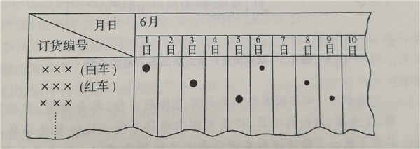步驟1 來自銷售商的旬訂貨,各銷售商在汽車廠基本生產(chǎn)計劃確定的本月領(lǐng)取輛數(shù)的范圍內(nèi),將最終分規(guī)格的10天份的訂貨在7天至8天前通過微機聯(lián)網(wǎng)提供給汽車廠的銷售部門(參看圖1)。所謂最終規(guī)格,就是將剛才講過的按大分類的規(guī)格的車型,進一步通過對任選部件(訂貨要求的裝備)的選擇、車的顏色的選擇細(xì)分后的規(guī)格。接著,在生產(chǎn)管理部門按照旬訂貨來計劃分工廠,分生產(chǎn)線的日產(chǎn)量,這就是對前面所講述的基本生產(chǎn)計劃的修正,另外,豐田汽車公司還要向各家銷售商報告圖2那樣的配送預(yù)定表( Delivery Schedule),這個預(yù)定表的編制,從接受旬訂貨開始需要兩天的時間。