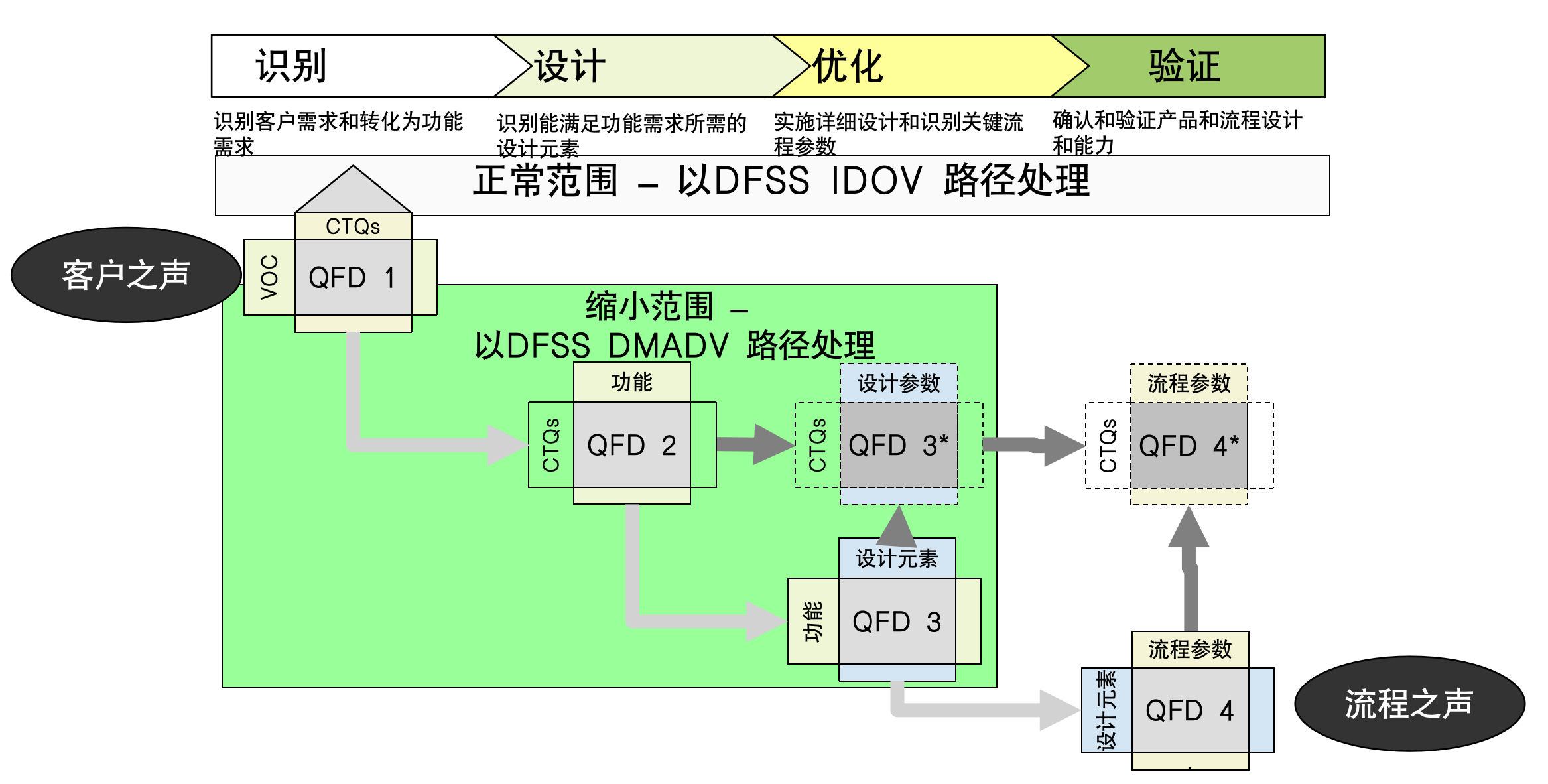 ·六西格瑪設計是一種從被動設計變為主動設計的方法,DFSS從市場和客戶的需求出發,根據總結了前人經驗的方法論體系,運用創新和設計的常用工具,將研發和設計工作變得可衡量、可預測、并可控制。
